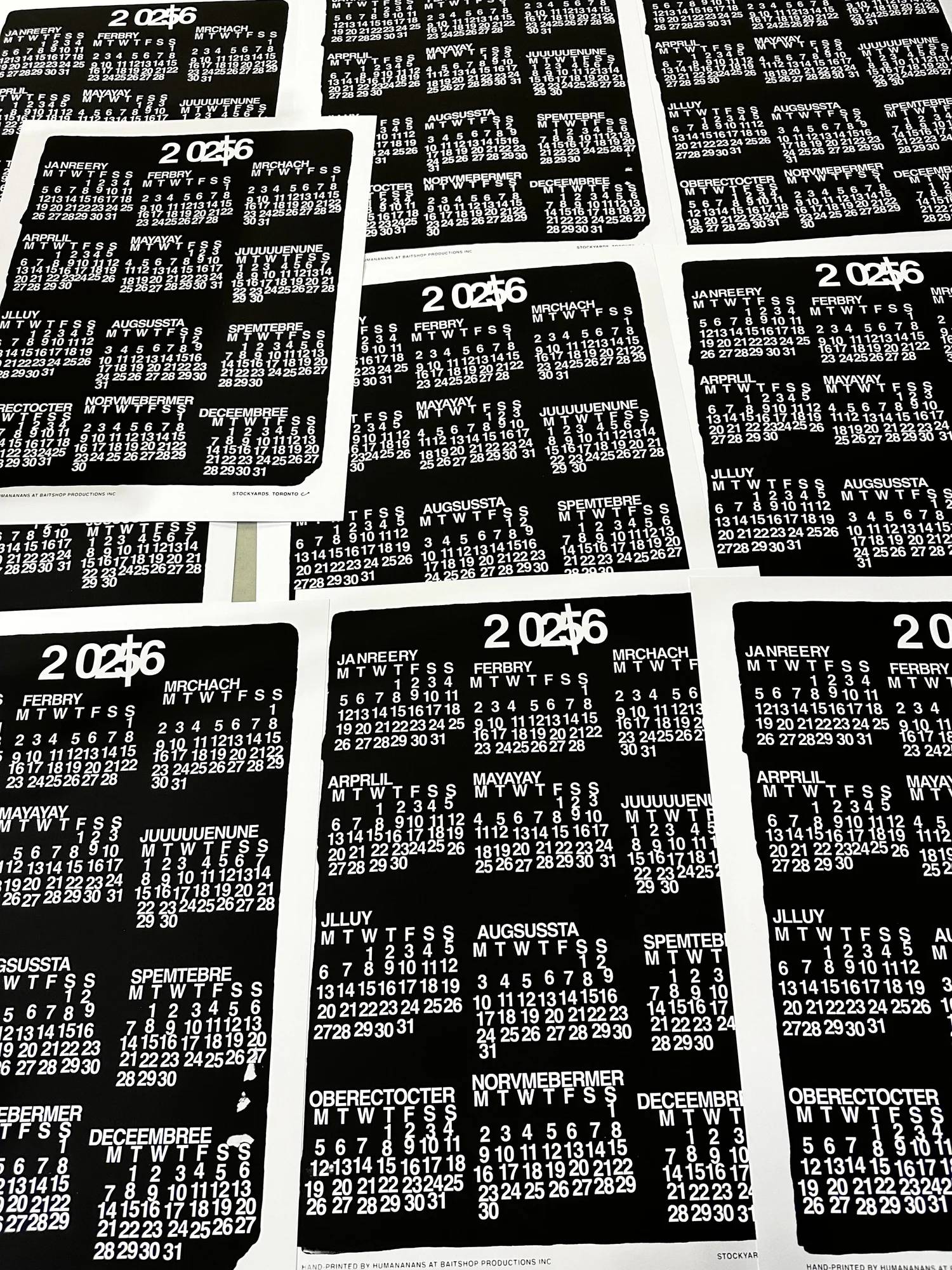 This 2026 calendar is a screen print collaboration between Flummox Industries and The Bait Shop. The traditional rigid design of a calendar is flipped on its head with misaligned date numbers and playfully misspelled month names. Instagram / Website