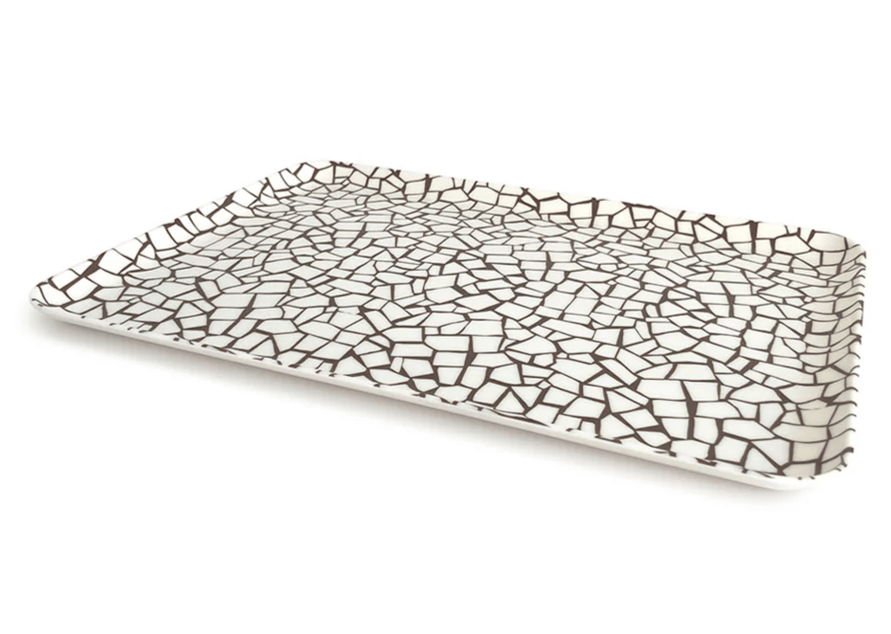 This crackle tray by Xenia Taler—smooth bamboo/melamine, but looks like a textured mosaic.