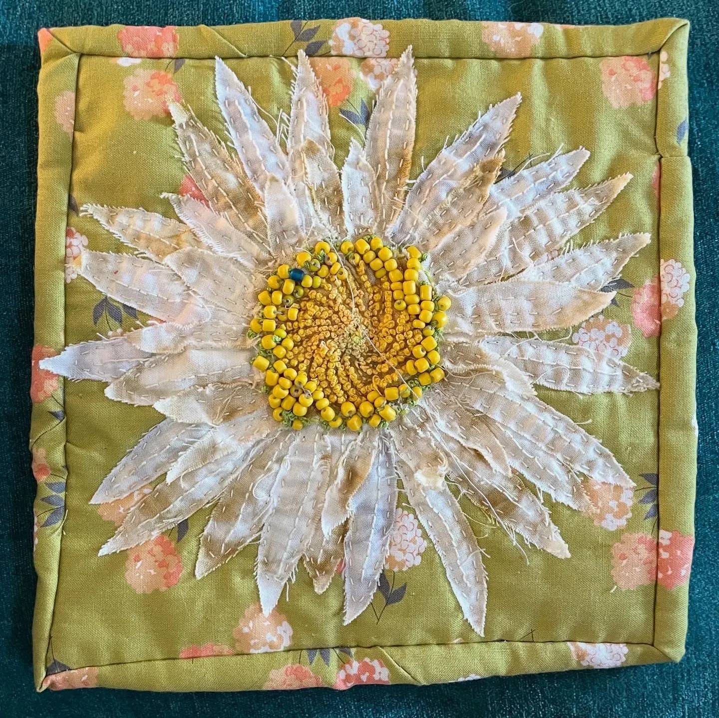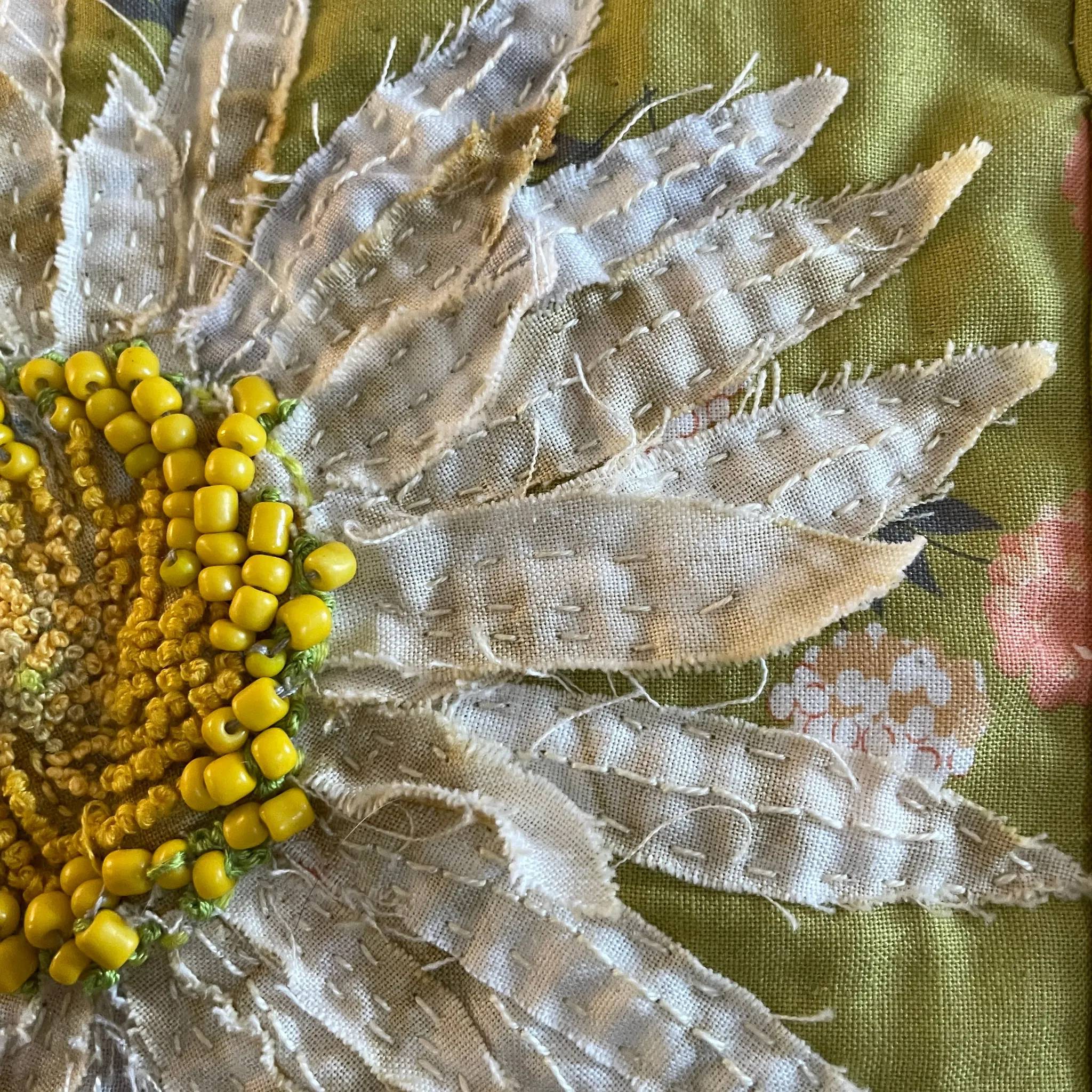 I’m an art specialist in a school that has a focus on our local ecology. On a nature walk with my students, I became fixated on the center of an oxeye daisy. It was math in nature and such a contrast to the soft petals! That same day, I set out to create a similar contrast using fabric collage, focusing on the center spiral. I experimented a lot with this piece, juxtaposing glass beads with tiny French knots, and allowing the raw edges of the petals to naturally fray. Instagram