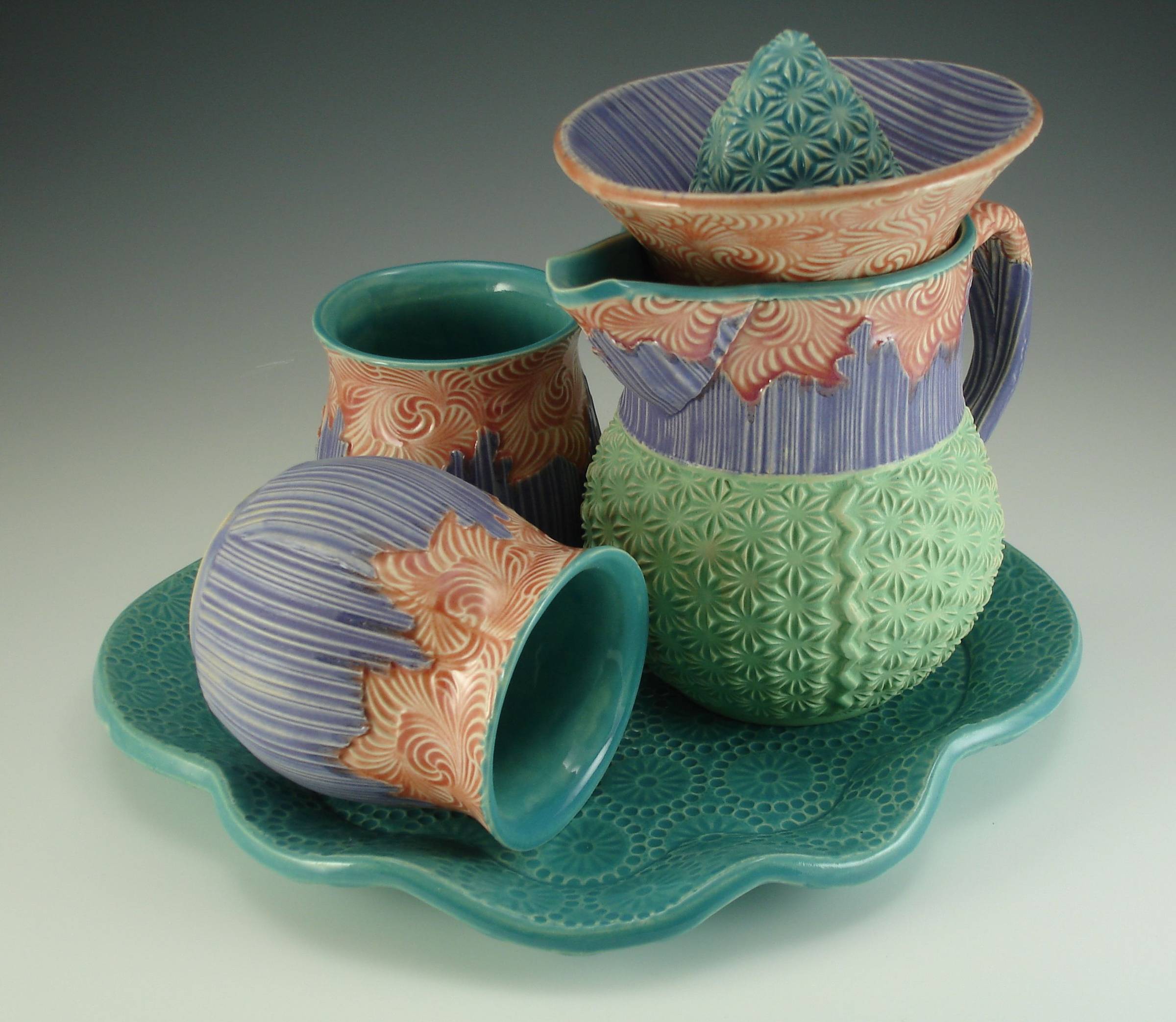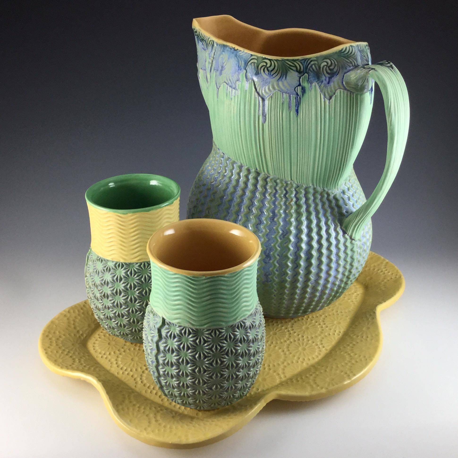 Within the bounds of functional objects, I compose in texture, color, pattern, shape, form, feel, and experience, as functional objects only reach their true potential during actual use. Impressing texture into the surface of clay creates an object with a rich and ever-unfolding sensory experience, giving the user a greater sense of engagement with each piece. Instagram / Website