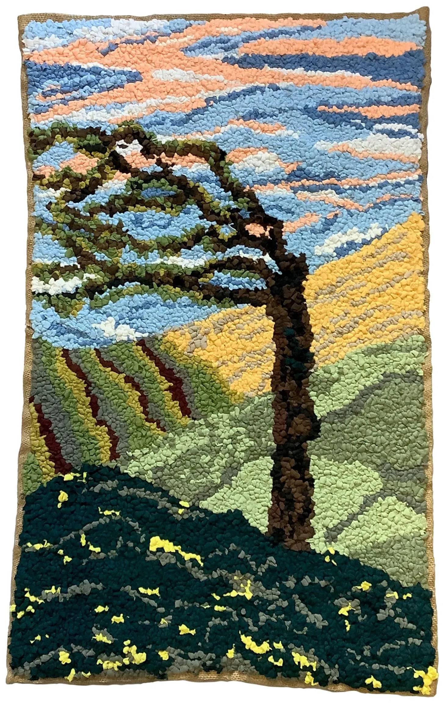 I create rag rugs from old t-shirts cut into strips and looped through sacking. The surface is uneven, which gives a lovely 3-dimensional texture to the rugs, which can also be used as wall hangings, as they are landscape pictures too. My work is inspired by the countryside, plants and birds of the South Downs in England, where I live. These two pieces celebrate the ancient trees, many of which have been forced to grow in one direction by exposure to the wind. Texture is an integral part of their appeal and key to the enjoyment I take in making them as I push the fabric through the hessian and see the image slowly taking shape.