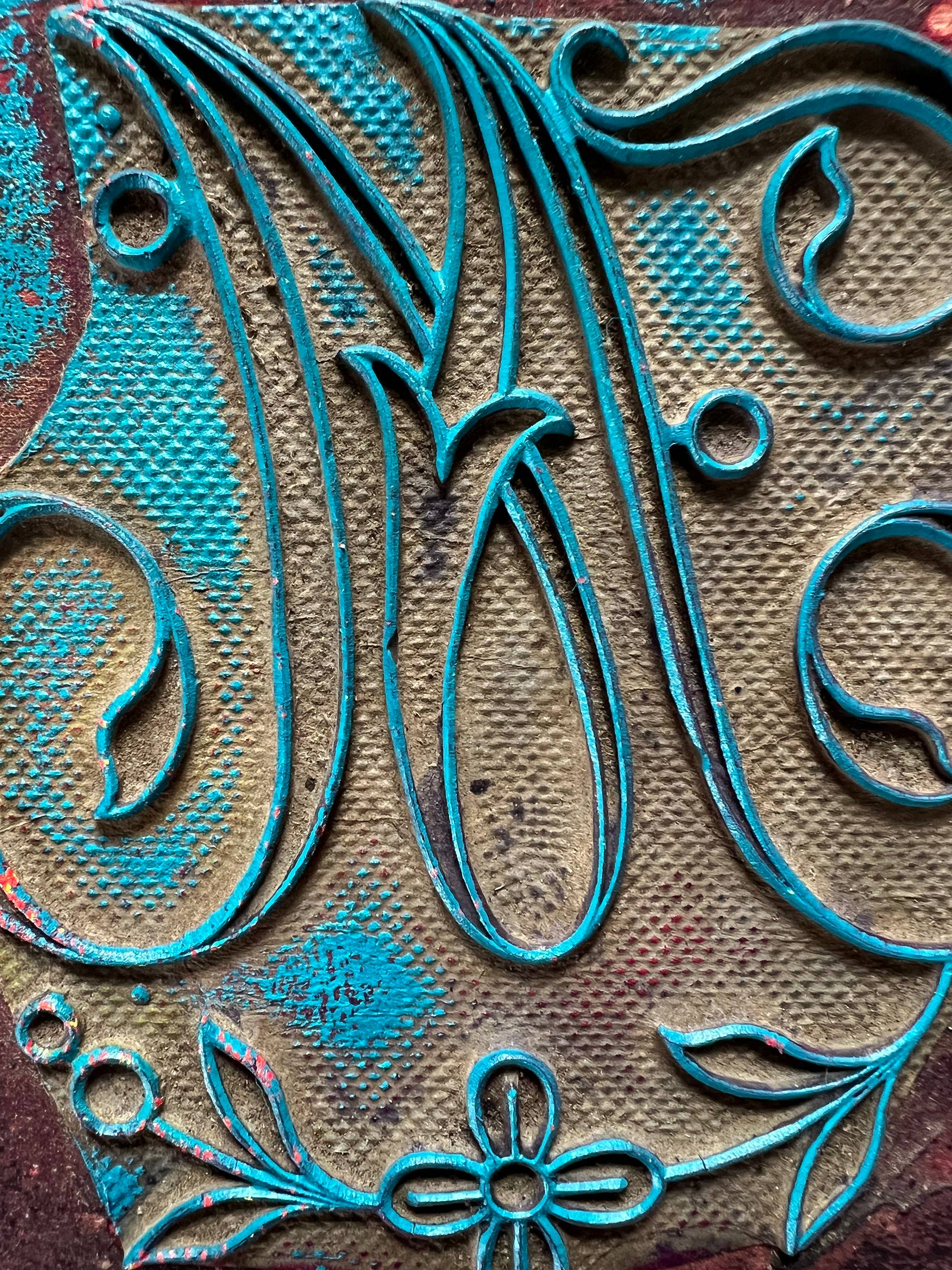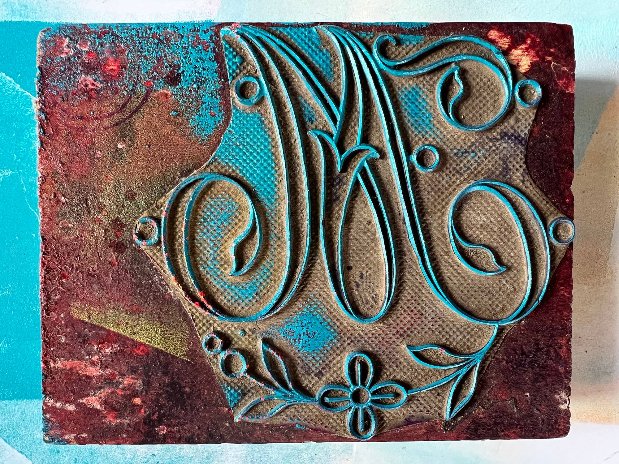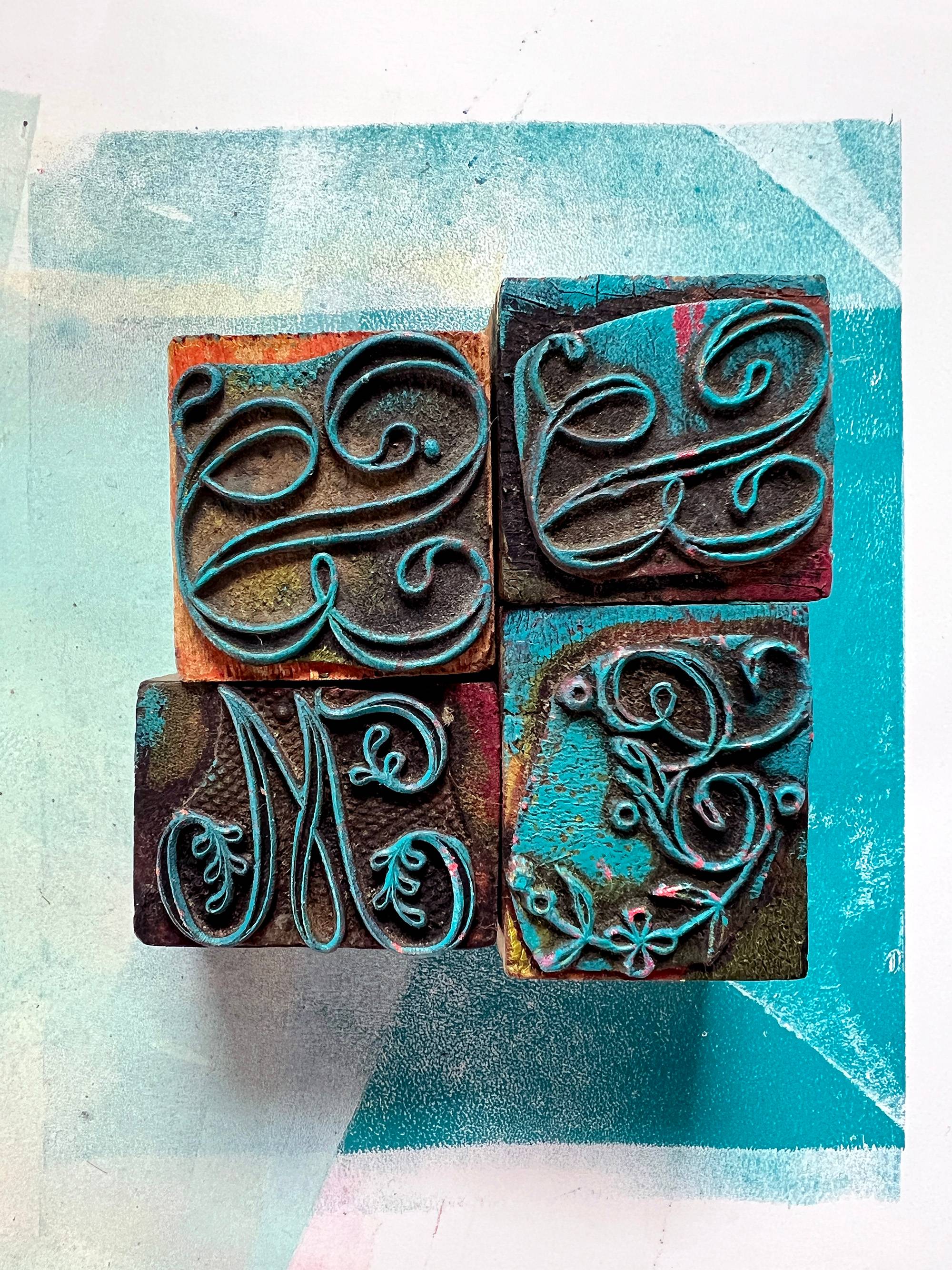 I'm impressing them into wet paint on a gelli plate. The resulting prints are beside the point; my intention is to enjoy the process—the satisfying motion of braying the paint onto the plate, the gentle squish of the monogram onto the surface, spending time up close admiring the beauty of these monograms that are over a century old.