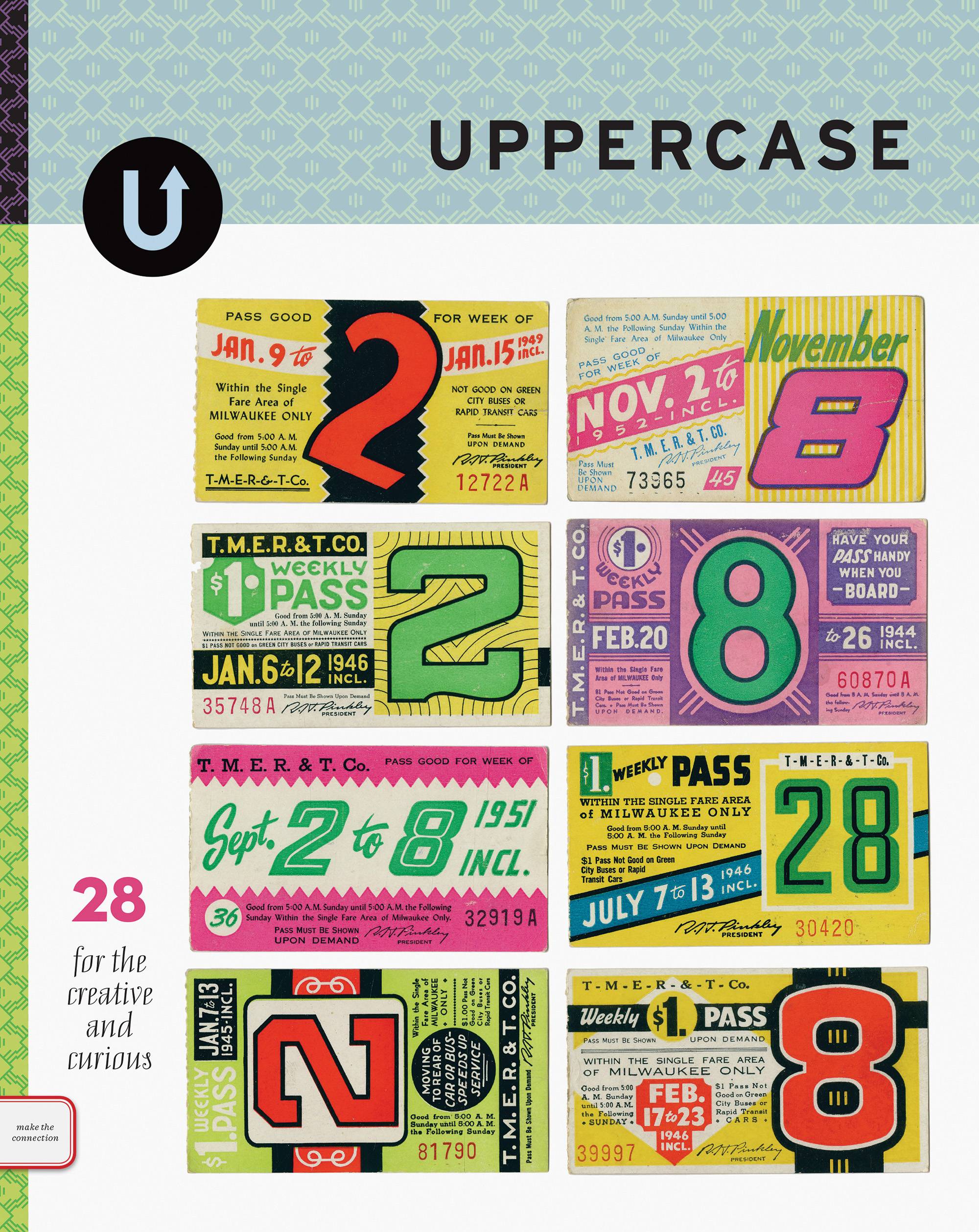 Long-time readers might recall issue #28 from a decade ago—it featured a collection of old Milwaukee bus passes (collection of Kindra Murphy). This issue is available in the UPPERCASE Archive.