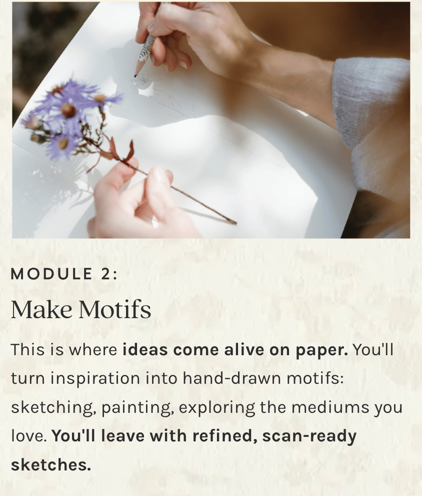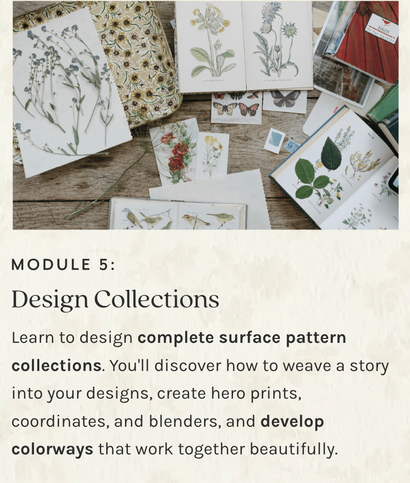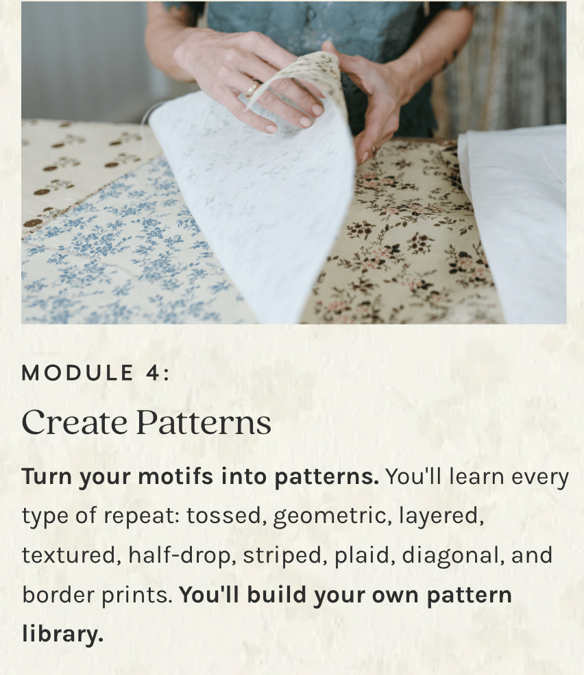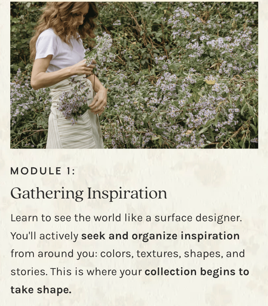 The Surface Design Immersion community is very welcoming and generous. There are people of all ages, interests and points in their creative journey. Whether you're brand new to surface design or have been in the industry for a while, you will find value in the course. It's encouraging, uplifting, and validating.