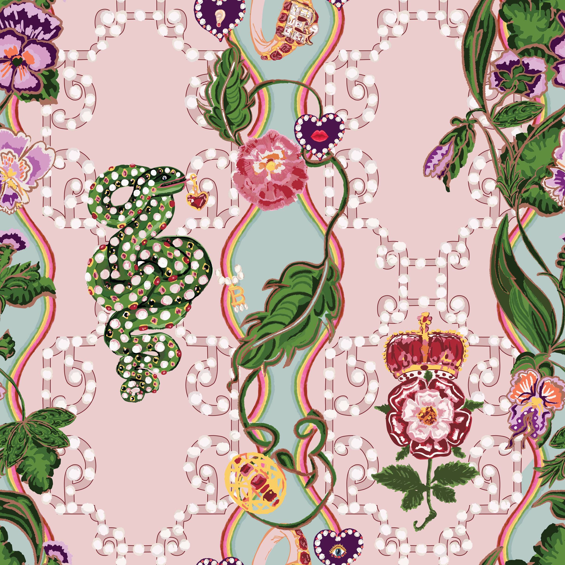 What makes my work feel fresh is the way I approach inspiration. Tudor & Ash is rooted in Tudor history, but not in the expected way. Rather than centering Henry VIII, I was drawn to the women around that story — especially Anne Boleyn and Elizabeth I — and to the idea of reinterpretation through a more emotional, feminine lens. The collection blends historical reference with painterly florals, symbolism, and a modern decorative sensibility, turning familiar history into something more intimate and unexpected. That combination of hand-painted richness, narrative depth, and a fresh perspective is what I hope defines my work.