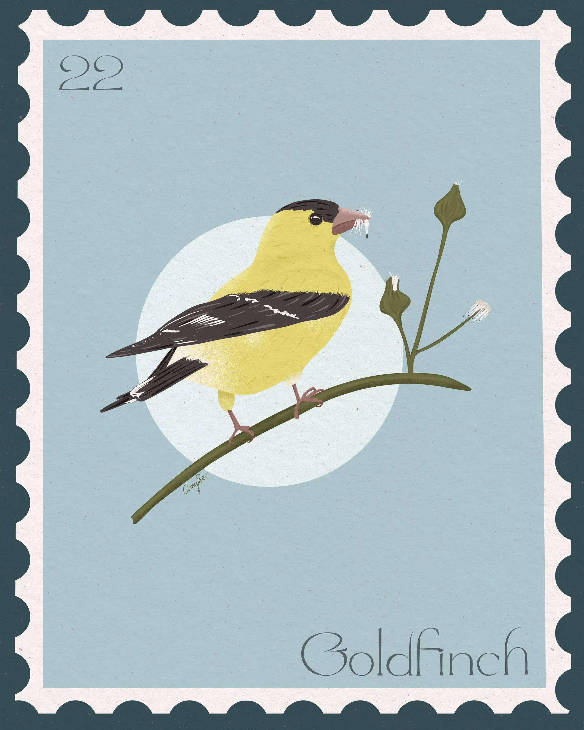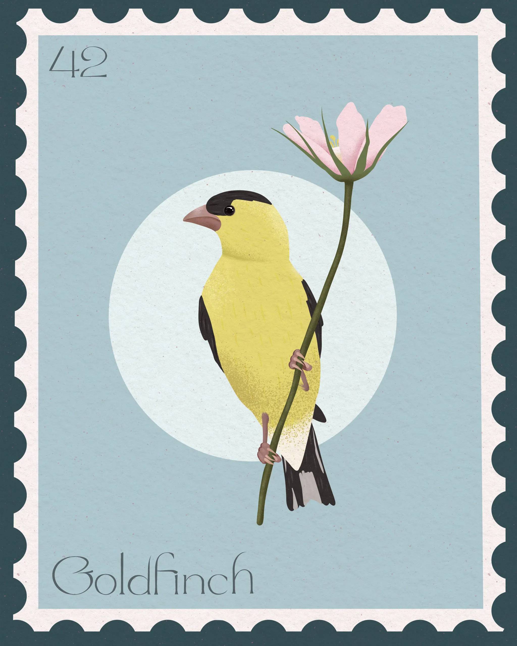 I'm an avid birder, and this year I had an unusually large number of goldfinches visiting my yard. Watching them flit between flowers and feeders became a daily highlight and inspired me to create this piece. I typically take dozens, sometimes hundreds, of reference photos, patiently waiting for the birds to land in just the right spot. I use those photos to capture natural poses to inform my artwork. Creating bird-focused art is a way for me to combine my love of wildlife with my creative work, and the goldfinch was a joy to bring to life. Instagram / Website