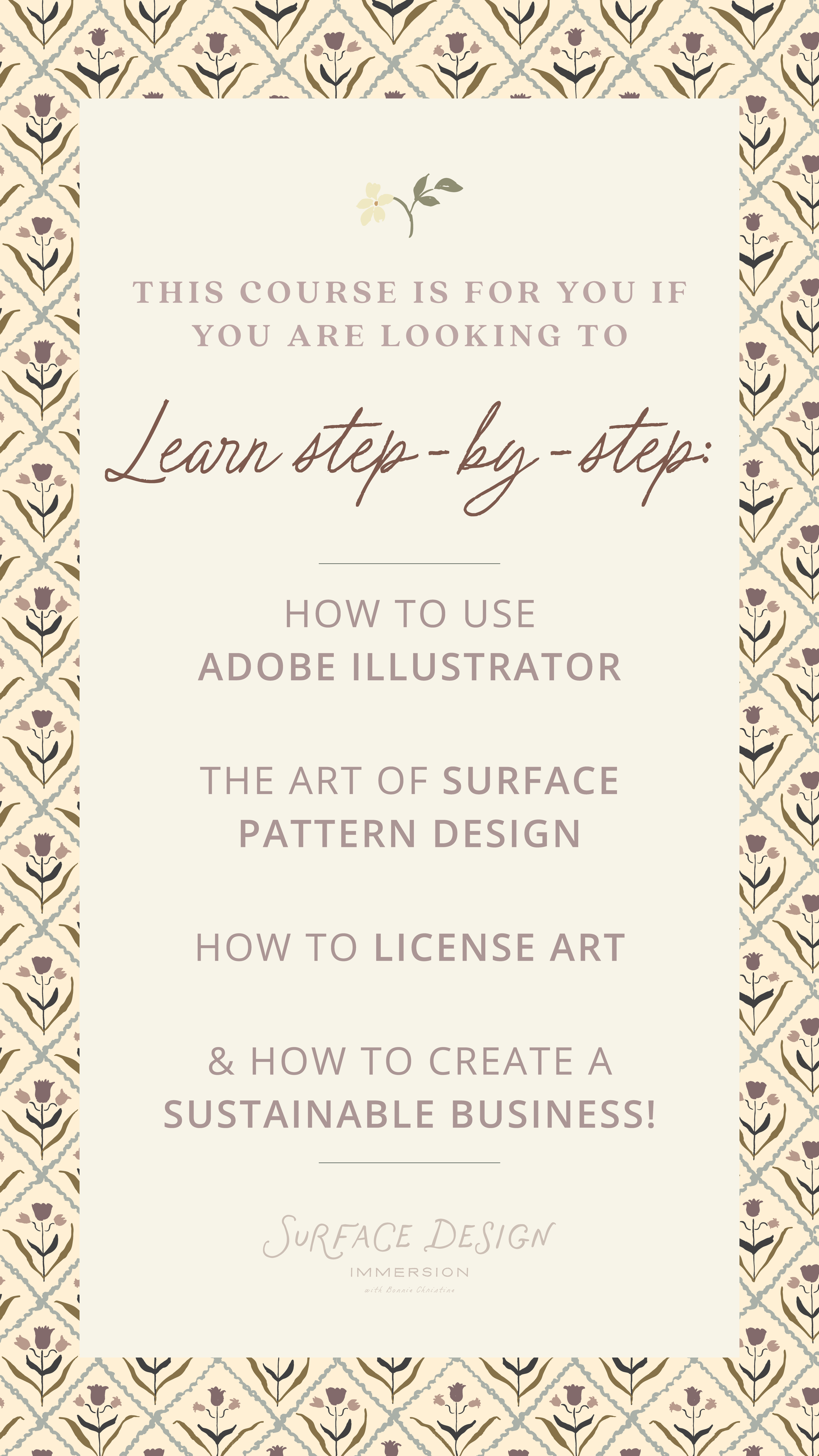 The course takes you from inspiration to motif to digitizing your art in Adobe Illustrator and learning how to create repeat patterns and entire collections.
