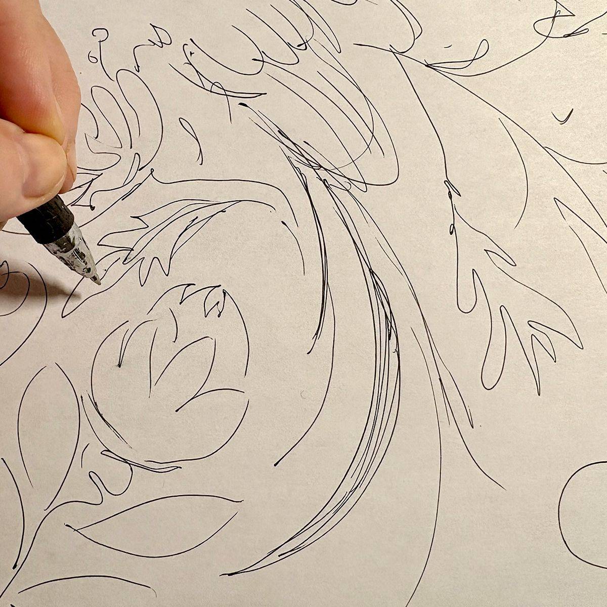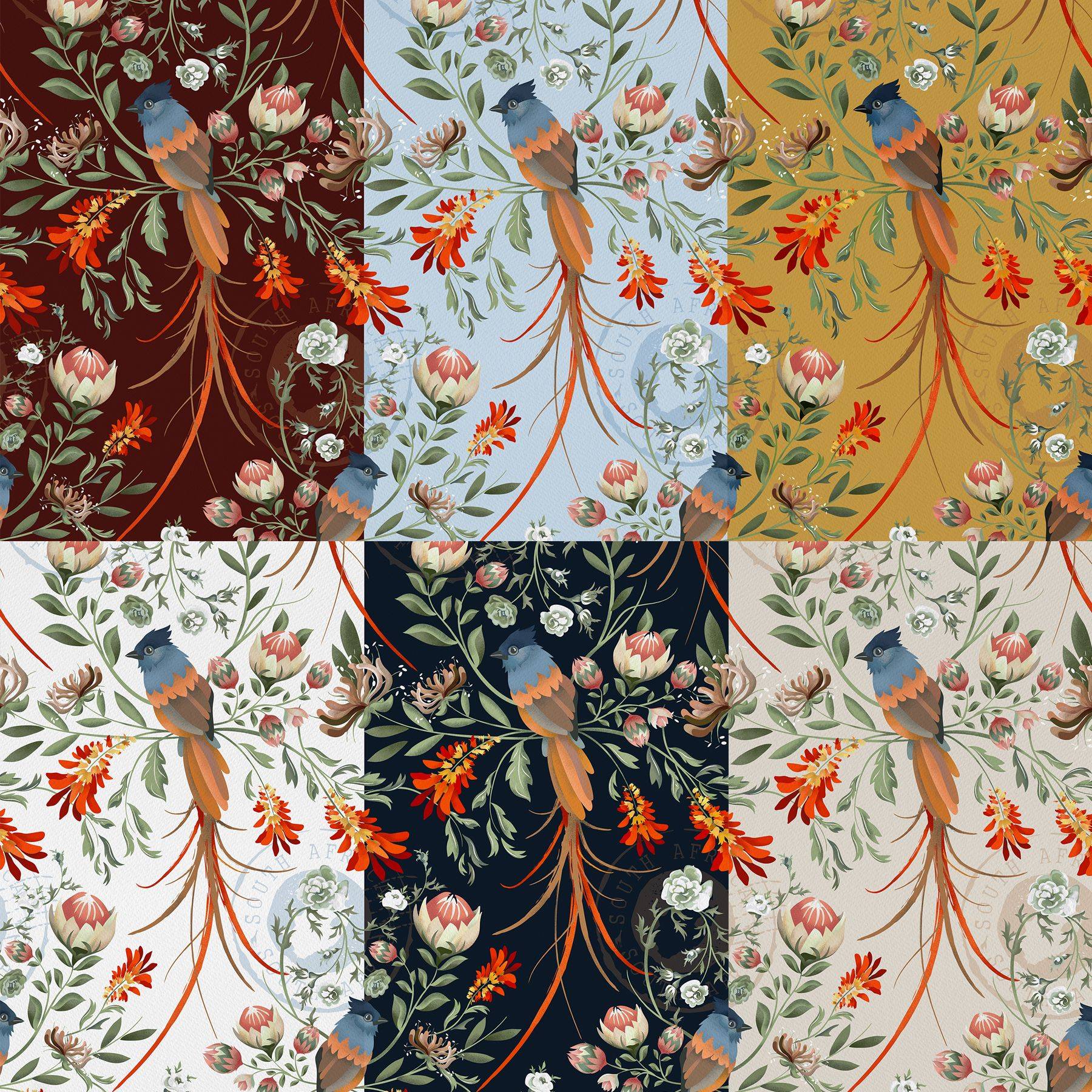 On a recent trip to South Africa, I was taken by all the sights and sounds, colours, and textures. The amazing people and the inspiring spirits moved me. I am still processing it all and producing individual prints and designs. I’m not rushing it. I’m sort of letting it come to me. I was very taken by the birds and the botanicals I saw. All so different from what I'm used to! This is my drawing of a South African bird I was in love with. It’s called the South African Paradise Flycatcher and has the most amazing tail feathers! Here it is with flowers that are common to the area – Protea, Silky Podalyria, and wild white Roses. I have it here in 6 colorways that feel like South Africa to me. Also, including a preliminary sketch to show the beginning of my process. Instagram / Website
