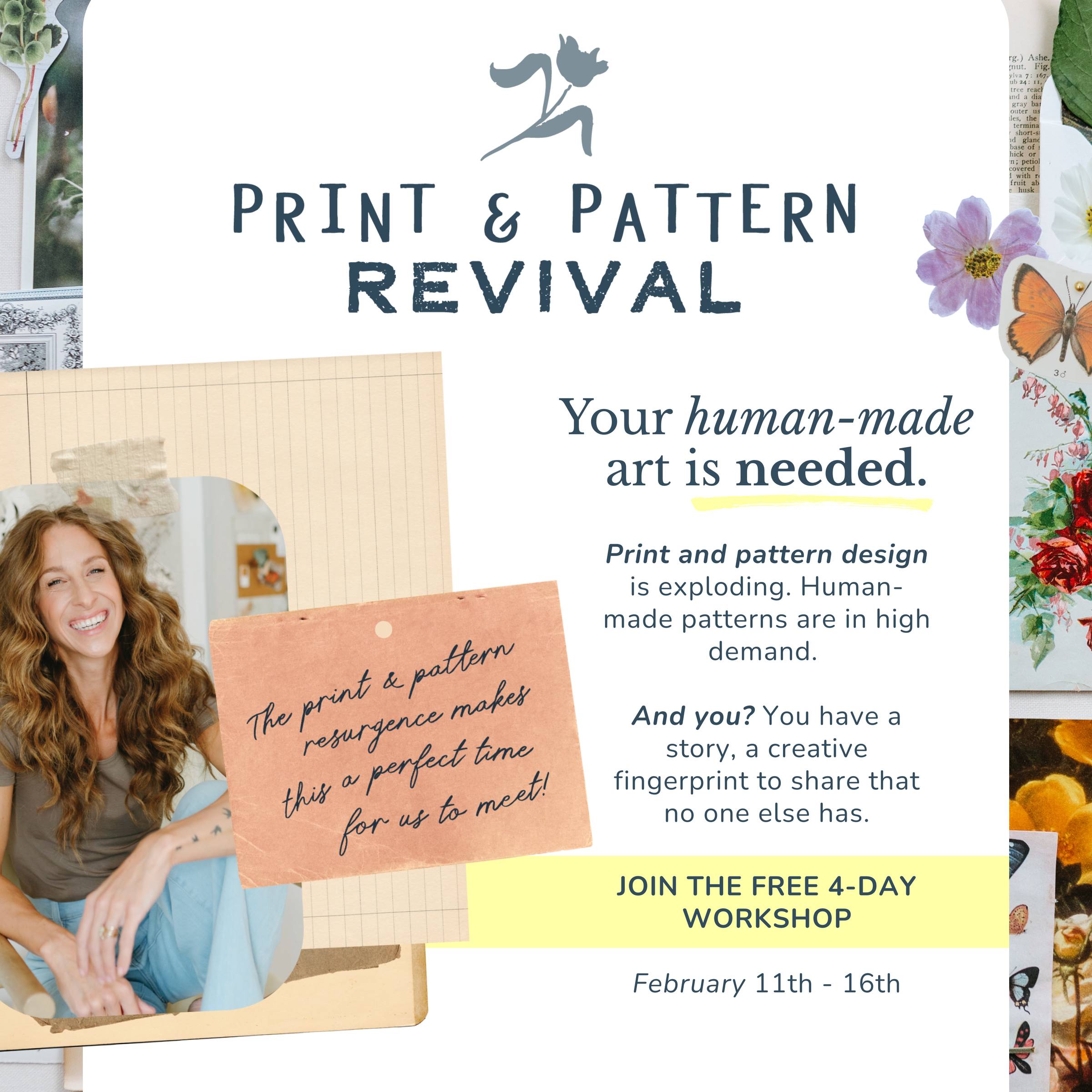 Print & Pattern Revival with Bonnie Christine is a free 4-day workshop introduction to a career in surface pattern design, running February 11–17. Here's the link to register for the Print & Pattern Revival. (I'm an affiliate partner for Bonnie's Immersion program again this year. Get on the waitlist; Immersion enrollment opens February 17.)