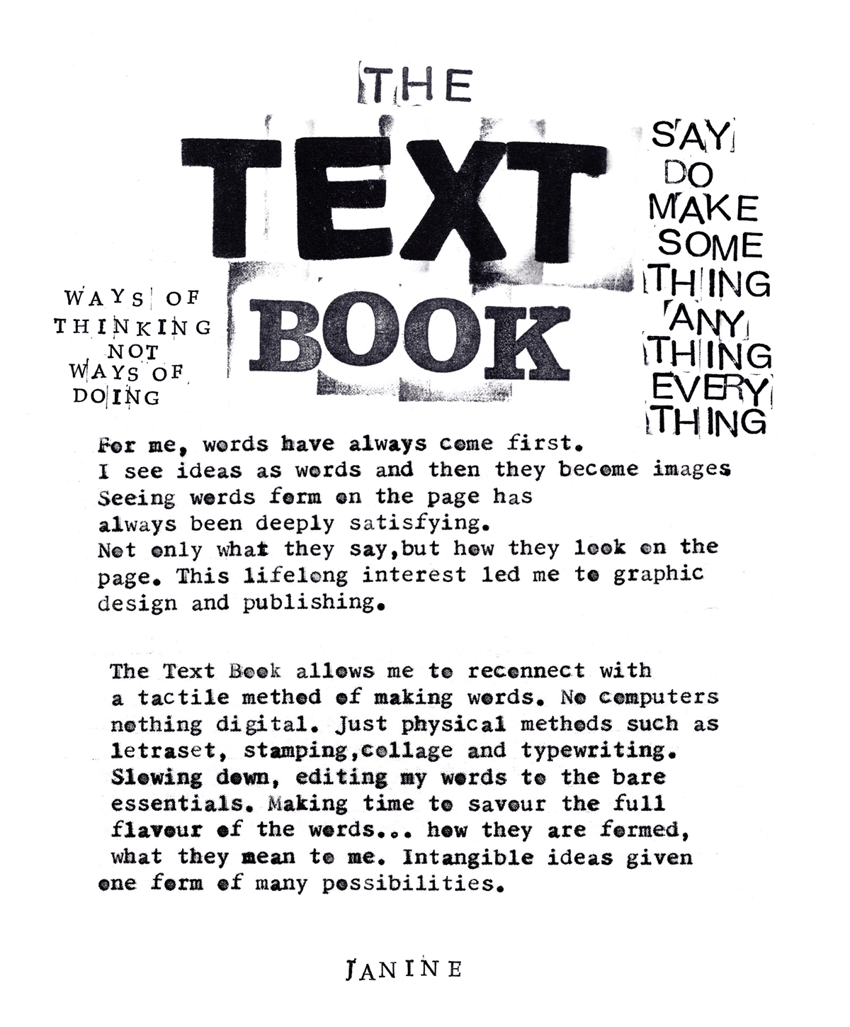 My session is called The "Text" Book. Through hand lettering, stamping, Letraset, collage and other found type, we'll employ copywriting and elements of graphic design in loose, poetic ways for self-expression.